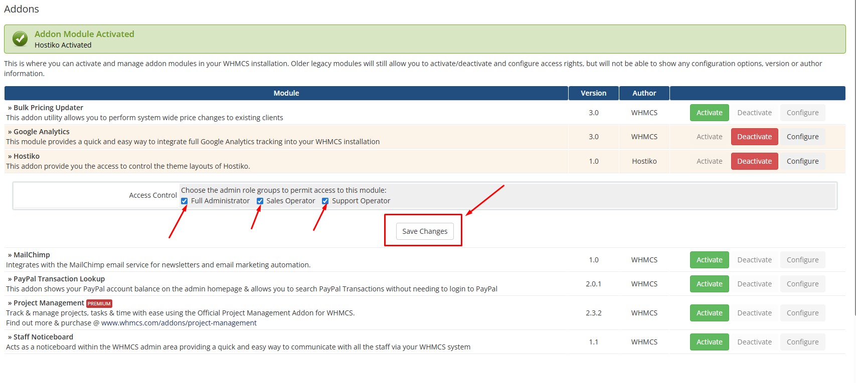 Check the check boxes to allow the module access and click on “Save Changes”.